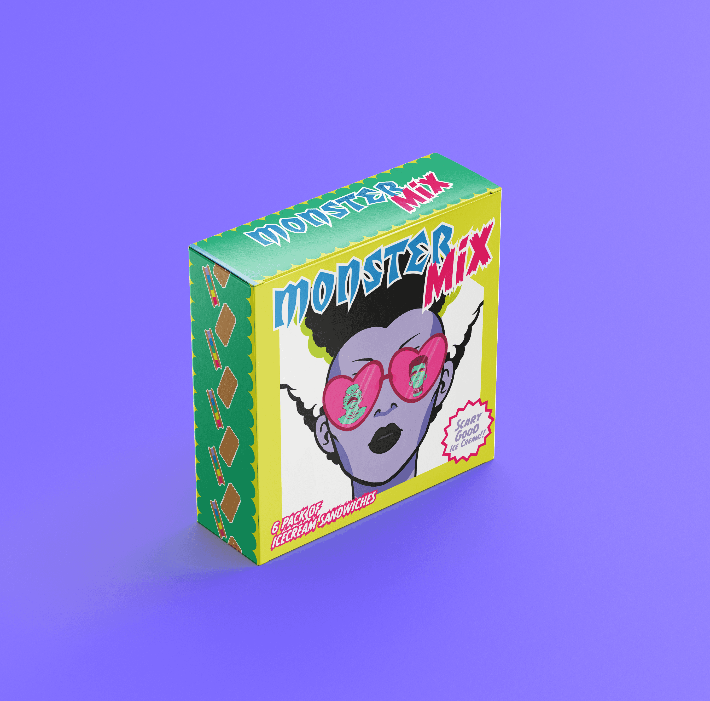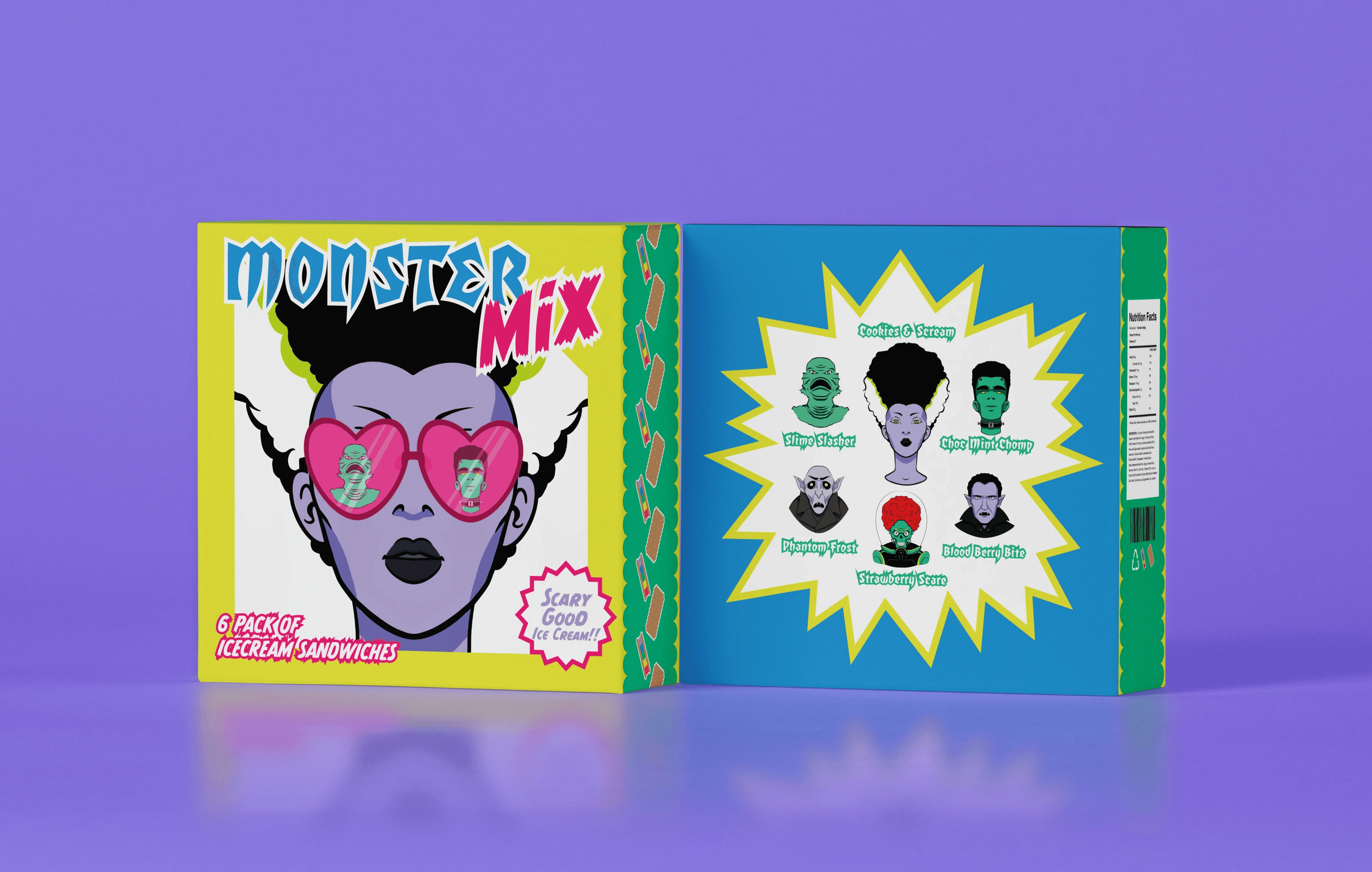 MonsterMix is a deranged dessert brand serving 1950s monster-themed ice cream sandwiches in a bold, collectible six-pack. Created for teens and young adults who love weird, wacky design, it blends dairy-free and dairy-filled flavours to suit dietary needs like lactose intolerance and allergies. With a tagline, “Scary Good Ice Cream!”, the brand champions vegan-friendly, non-GMO options while embracing playful horror nostalgia. The packaging is eco-friendly, recyclable, and highly visual: using bright colours, quirky characters, and retro monster storytelling designed to dominate the shelf. MonsterMix taps into trends of sustainability, bold branding, and social media appeal, turning every bite into a cult-worthy experience.