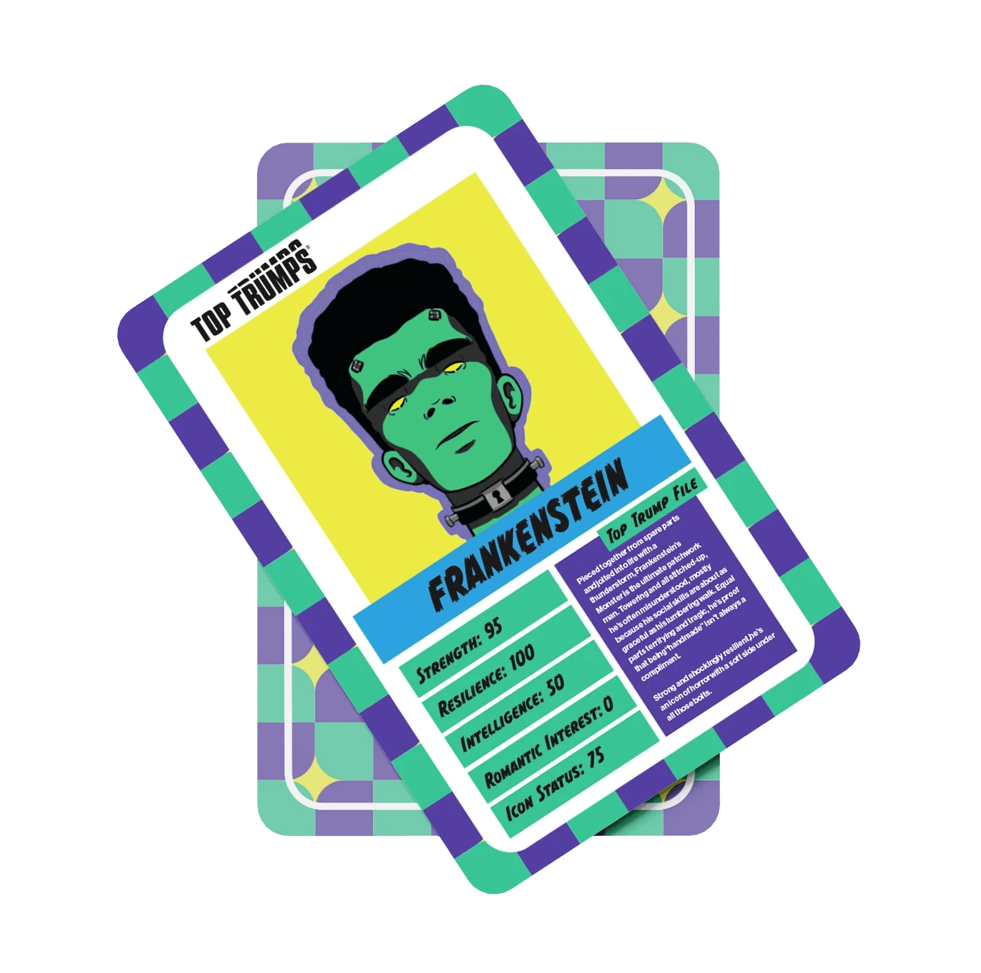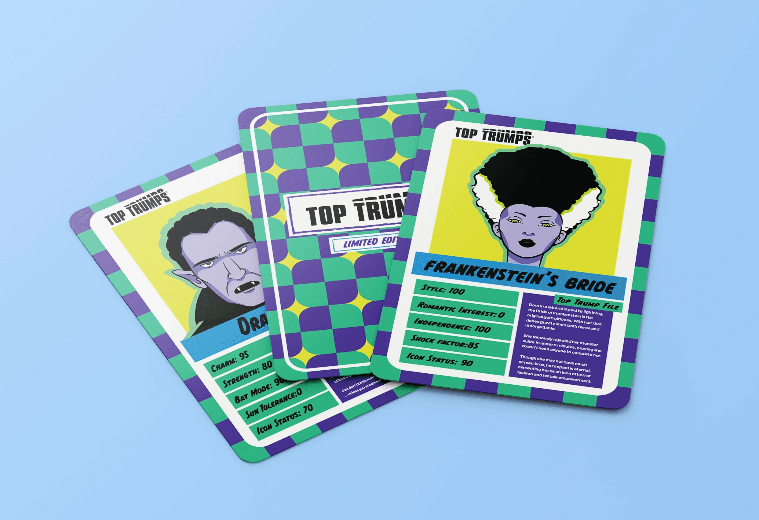 This project is a sustainable Top Trumps card collection inspired by Halloween, classic sci-fi, and retro monster fandoms. Featuring bold illustrations, bright colours, and tongue-in-cheek humour, each card reimagines iconic creatures with a playful twist. Designed to be both collectible and shareable, the set taps into nostalgic trading culture while celebrating fan creativity. As a personal passion project, it reflects my love for horror, comics, and cult classics (recurring themes throughout my work). By combining eco-conscious production with vibrant character design, the collection offers a fun, quirky experience that invites players to engage, trade, and connect through shared fandom.